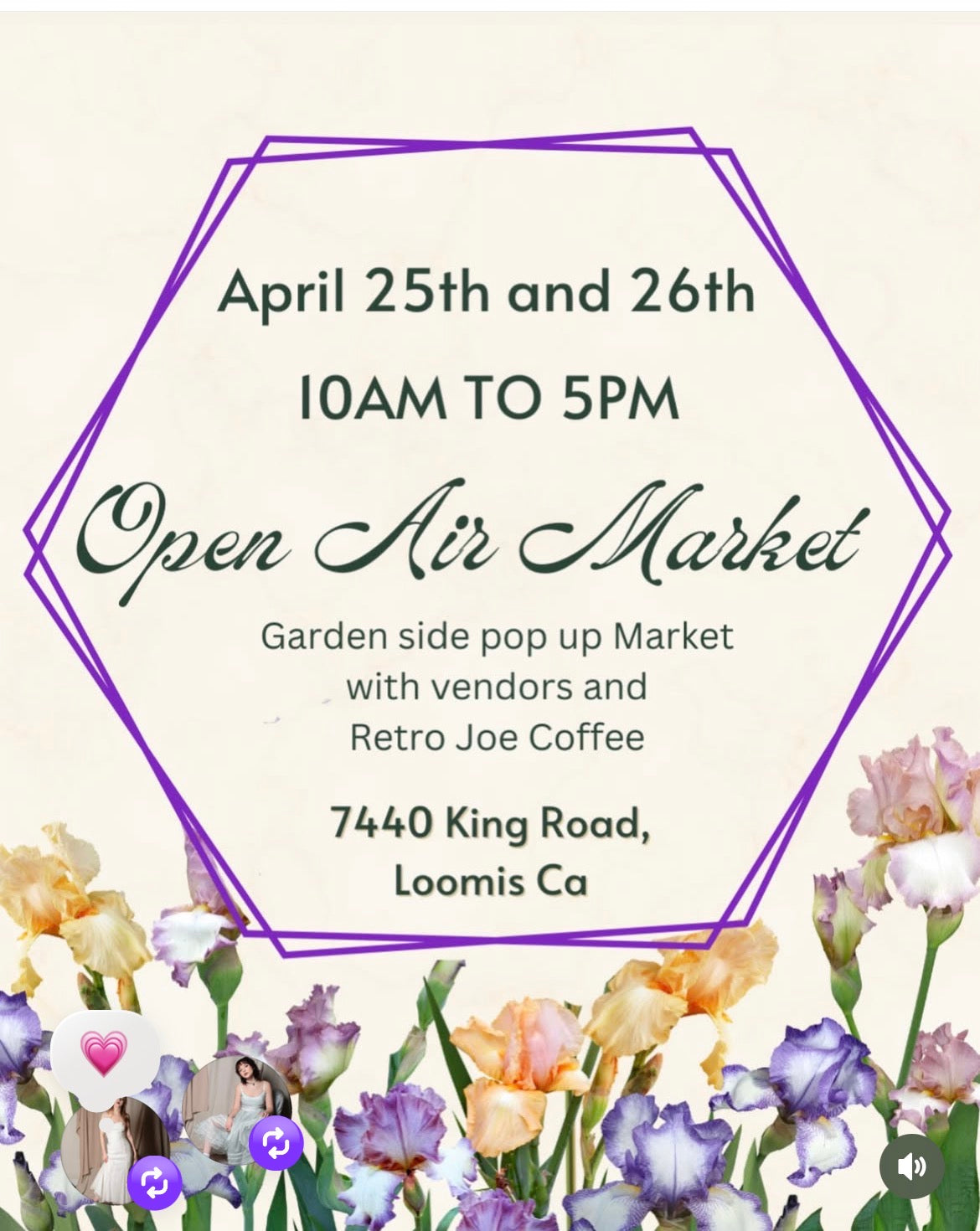 Directions to eventPlease join me at the Open Air Market in beautiful Loomis, in the Horton Iris Gardens. Stroll the Iris Gardens and check out some local makers/artisans.