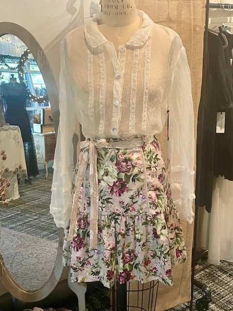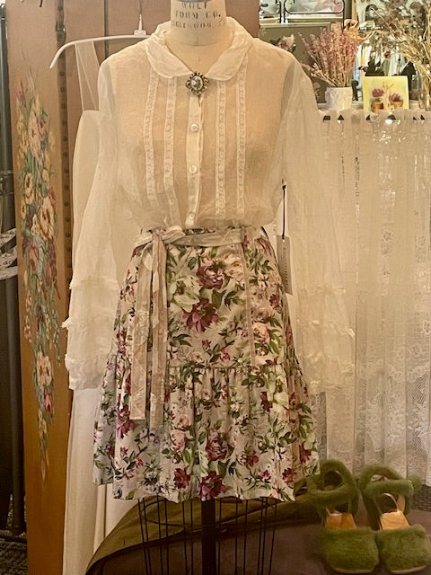 Vintage Inspired Estelle Blouse in sheer natural white washed silk organza, shell buttons, ruffled details, vintage lace trim.