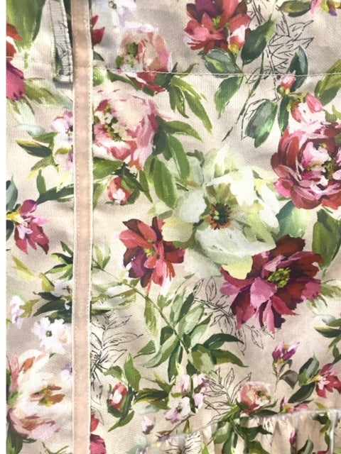 This pretty floral 100% cotton skirt has structure and flounce. The waist has belt loops, the main body of the skirt has style lines for a fitted shape, the wide flounce at the hemline bring the feminine touch, and it's adorned with a bit of velvet trim for added interest.