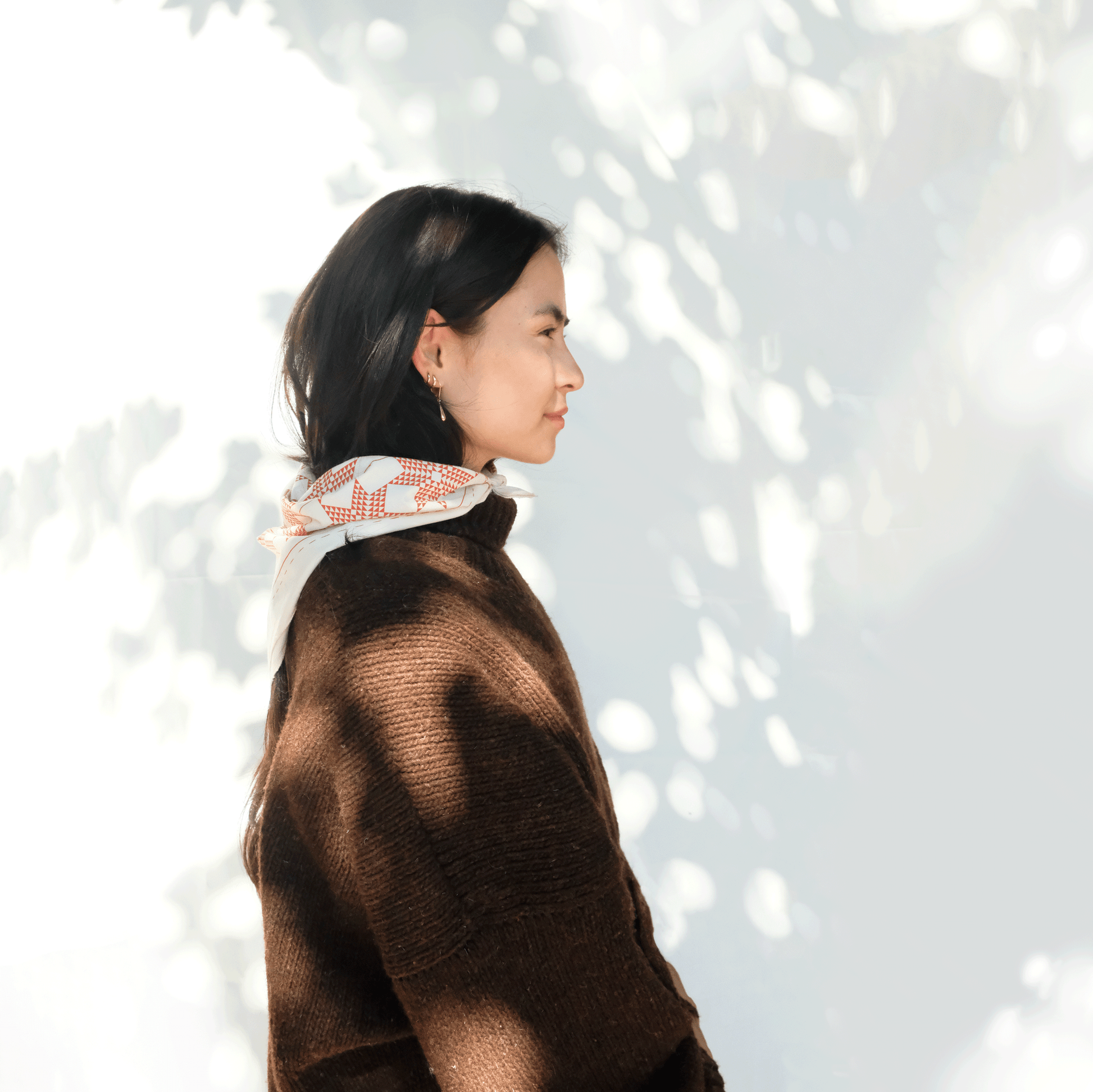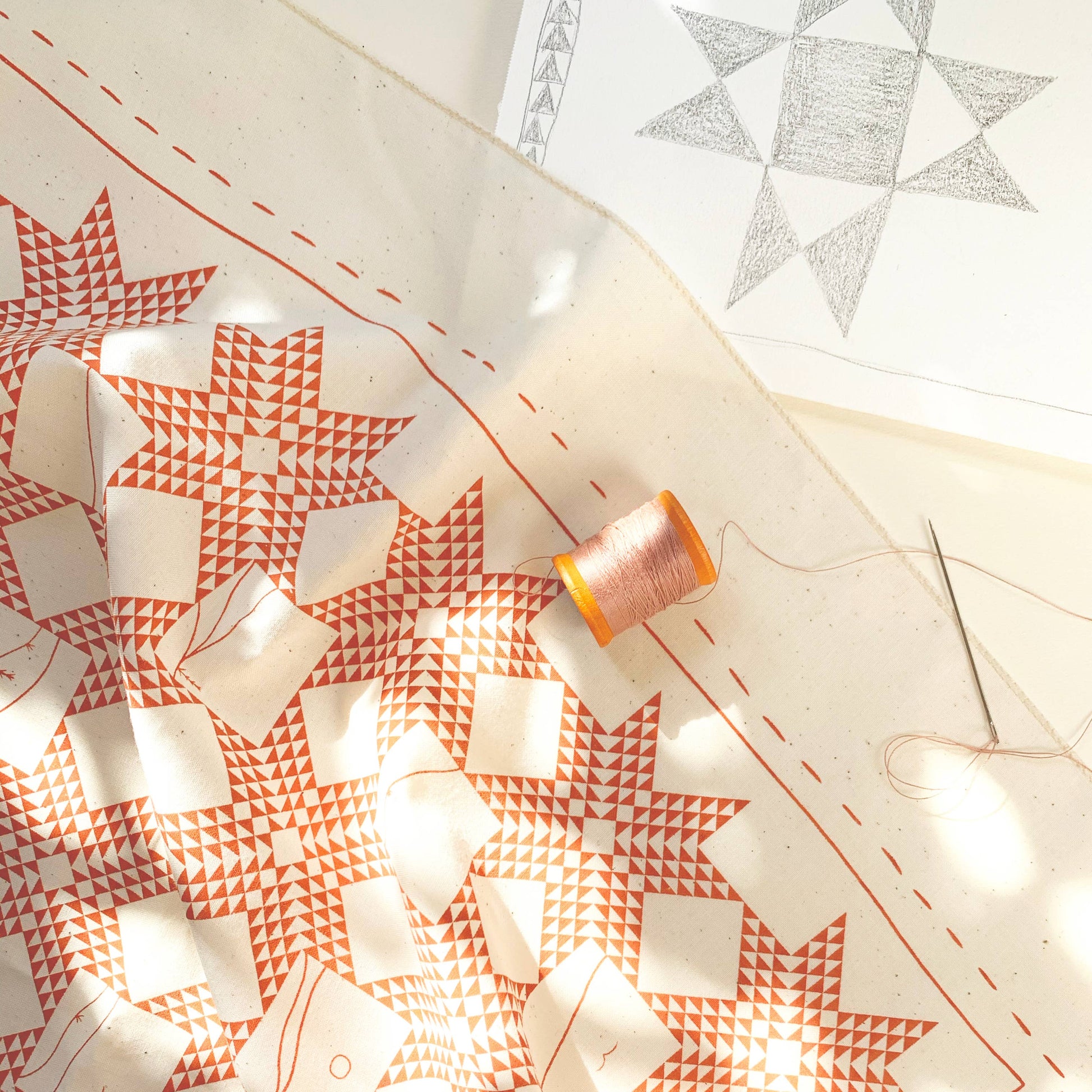 I created this pattern with geometric stars and meandering landscapes as glimpses through portals or windows - like memories and photographs; moments suspended in time. Designed as an exploration of lineage and connection. My grandmother is a quilter and artist, and I’ve been surrounded by her handcraft for as long as I can remember. I grew up with one of her quilts always on my bed or hanging on my walls, and I learned to sew by watching her work. Her quilts featured details that spoke to my interests -- sewn stitch by stitch as tapestries of stories. I have such sweet memories of wandering through her sewing room and sorting through her fabric scraps and unfinished pieces, each color, and pattern telling its own story. As my grandma isn’t sewing much anymore, I'm creating pieces that honor her work, through my own lens and craft. _____ -Size: 22 x 22” -Materials: 100% unbleached cotton, water-based ink -Care: Machine or hand wash with like colors, tumble or line dry